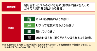 また「鍼灸大成」では、鍼が邪気に引っ張られ鍼が重く感じると、金属に邪気が引き寄せられ鍼を引っ張ると考えます。しばらく鍼を放置して邪気を鍼に吸い寄せて抜鍼します。得気によって邪気を抜き、生気を助けられます。 鍼灸治療を受けた後、気持ちがすっきりし耳や目がはっきりして、身体が壮快になるなどの変化が生じます。これは鍼灸によって、体内気血の調和および正気を助けられ陰陽の調整をして、健康な身体が維持されるためです。